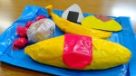 オムライスは新聞紙をまるめてテープを貼って作りました。