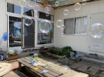 普通の吹くしゃぼん玉だけでなく、針金のハンガーを使った大きな枠や電動のシャボン玉機でもシャボン玉を作りました。